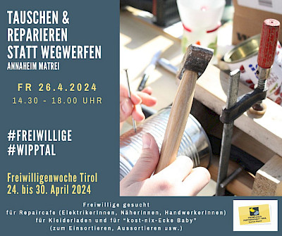 Wir planen für Freitag, 26. April 2024 eine Veranstaltung rund um die Themen REPAIR-CAFE, KLEIDERTAUSCH und BÜCERFLOHMARKT im Annaheim Matrei am Brenner. Umgestzt wird die Veranstaltung im Zuge der Freiwilligenwoche. Dafür sind wir auf der Suche nach handwerklich begabten WipptalerInnen, die an diesem Tag ehrenamtlich mithelfen wollen und einen Beitrag bei kleinen Reparaturen leisten wollen - Haftung für die zu reparierenden Stücke (z.B. defekte Toaster, löchrige Hose, kaputter Fahrradreifen,...) übernehmen die HelferInnen selbstverständlich keine!